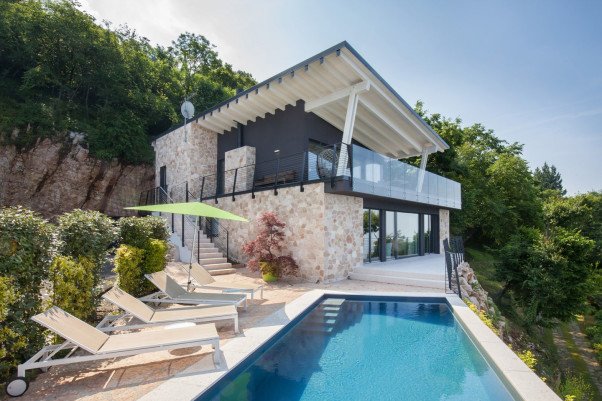 Charmante und elegante Ferienvilla für 8+2 Personen mit Privat-Pool in herrlicher Panorama-Lage nur 15 km vom adriatischen Meer. Gute Einrichtung und Ausstattung, Smart-TV, Internet, Klima-Anlage, gemaueerter Grill, Parkplätze auf dem Grundstück.