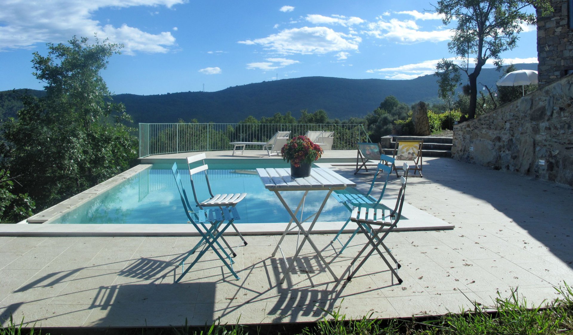 Über ein paar Stufen erreicht man den 2016 gebauten Pool (8 x 4 m, 1,50 m tief, gesamte Saison geöffnet) mit großer Panoramaterrasse, 5 Sonnenliegen, Sonnenschirm und Außendusche.