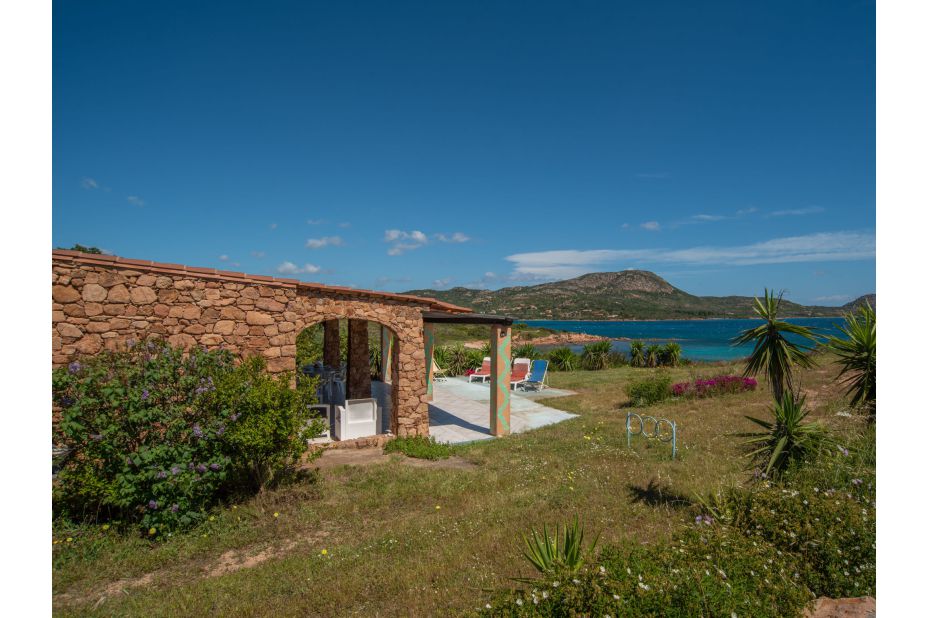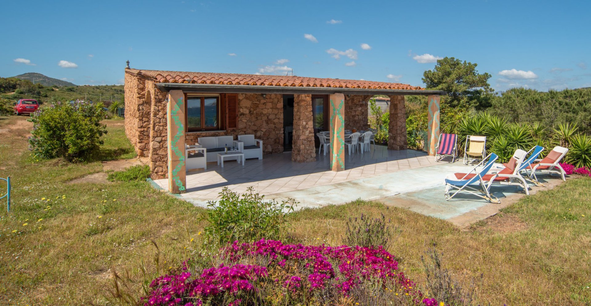 Eine Terrasse mit schattigem Porticato mit Blick aufs Meer, Liegen, eine Außendusche, Parkplatz