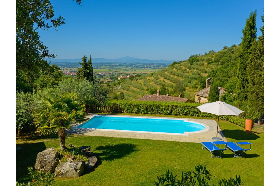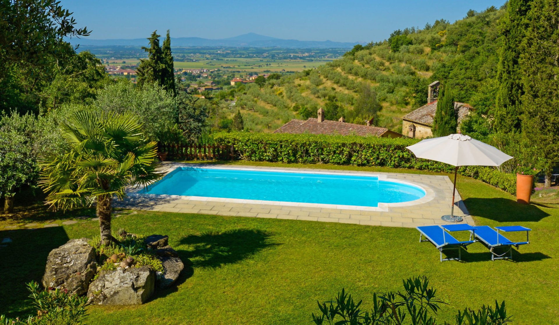 Die Villa Il Farinaio liegt in einer wunderschönen und ruhigen Hügel-Lage mit Blick auf das Tal zwischen Cortona und dem Lago Trasimeno, nahe der Grenze zu Umbrien.