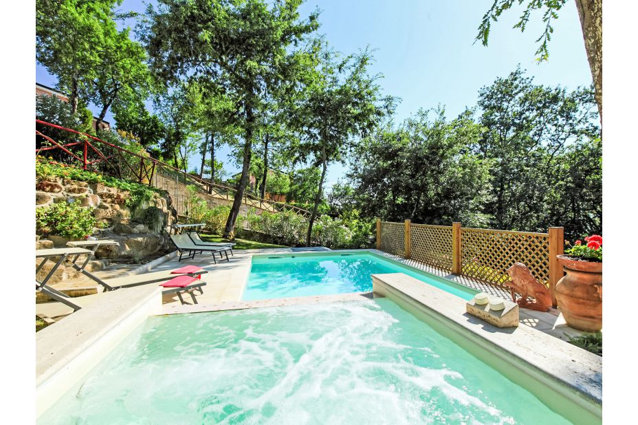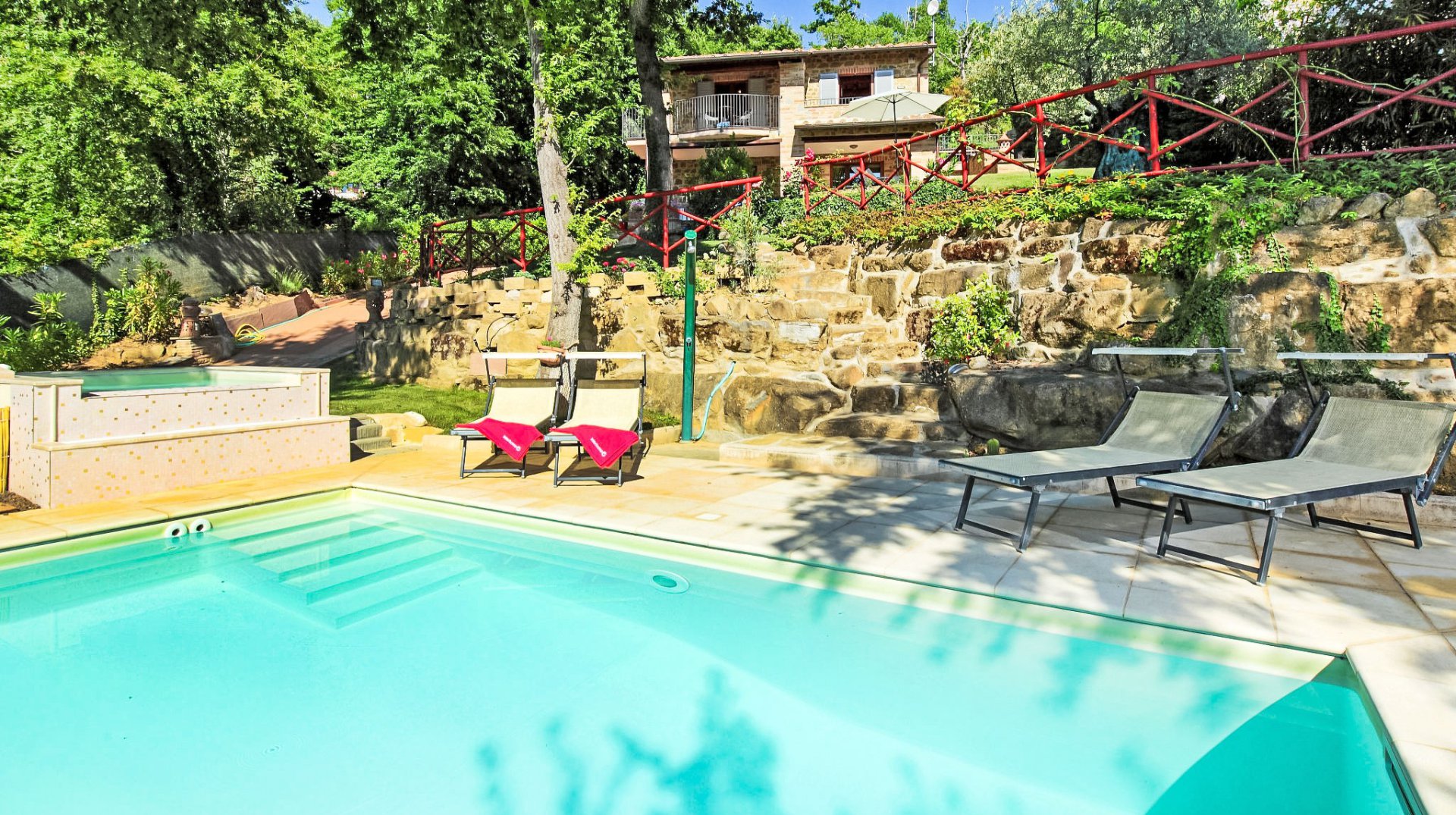 Auf einer Terrassen-Ebene unterhalb des Hauses liegt der private Swimmingpool mit Liegen, Sonnendeck, Außendusche und einem kleinen Whirlpool an das Schwimmbecken angedockt.