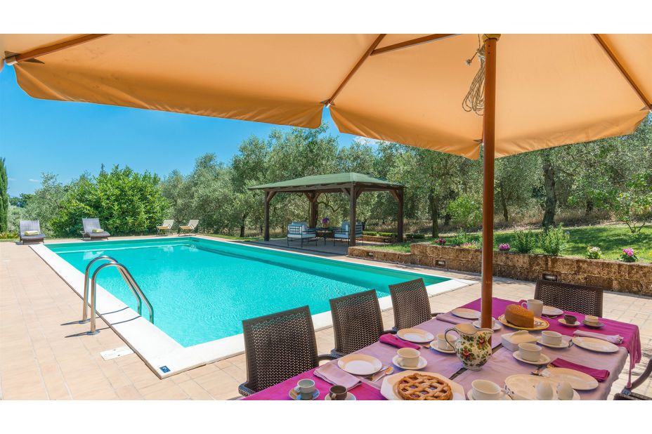 Der Pool befindet sich in einem zentralen Platz im schönen Garten vor der Villa, von der es eine Handvoll Meter entfernt ist und entlang einer gepflasterten Gasse erreichbar ist. Das rechteckige Becken, ausgestattet mit einer Leiter für den Zugang zu Wasser, misst 5 x 12 m und hat eine gleichmäßige Tiefe von 1,20 m. Es ist mit Folie belegt und wird mit Chlorbehandlung gereinigt.