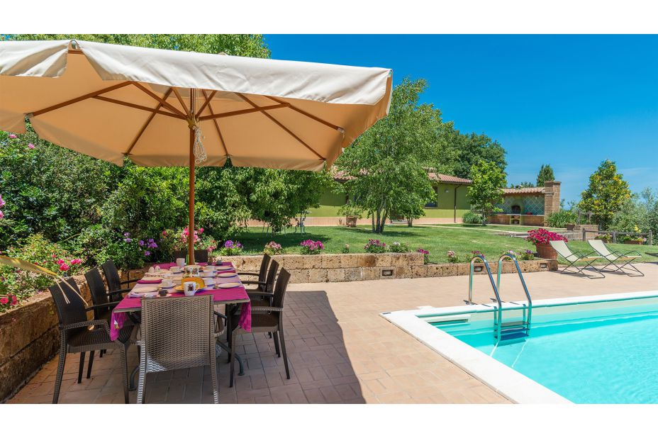 Rund um die Liegewiese, gepflastert in Terrakotta und umgeben von zwei Seiten von niedrigen Wänden aus Tuffstein und bunten Blumen ist mit Sonnenliegen, Liegestühlen und einem Pavillon mit Sesseln und einem Couchtisch ausgestattet.
