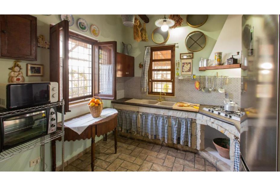 Die angrenzende Küche ist typisch sizilianisches Mauerwerk mit, auf der Seite, eine Speisekammer mit Geschirrspüler.