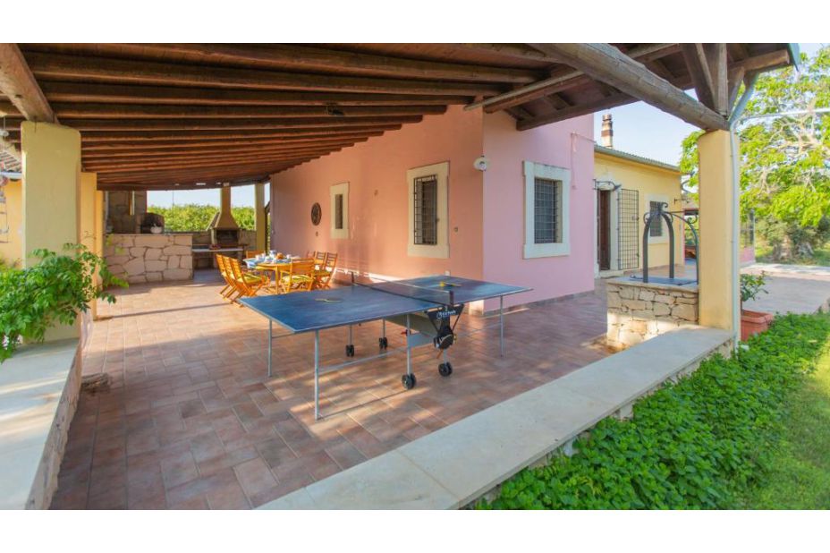 Das Haus verfügt über einen großzügigen, möblierten Außenbereich mit Essplatz, Grill und Holzofen, Tischtennis -