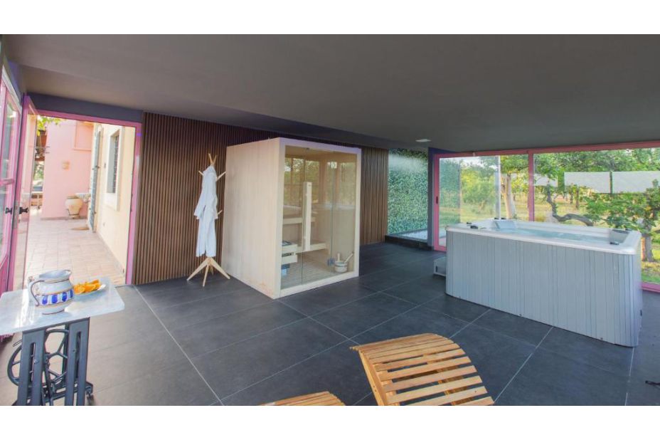 Das Spa mit separatem Eingang besteht aus einem 4-sitzigen beheizten Whirlpool, einer 2-sitzigen finnischen Sauna, einer Erlebnisdusche und einem Ruhebereich mit Chaiselongues.