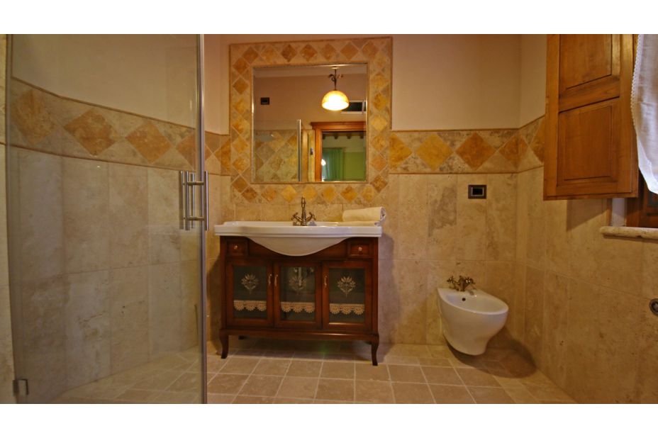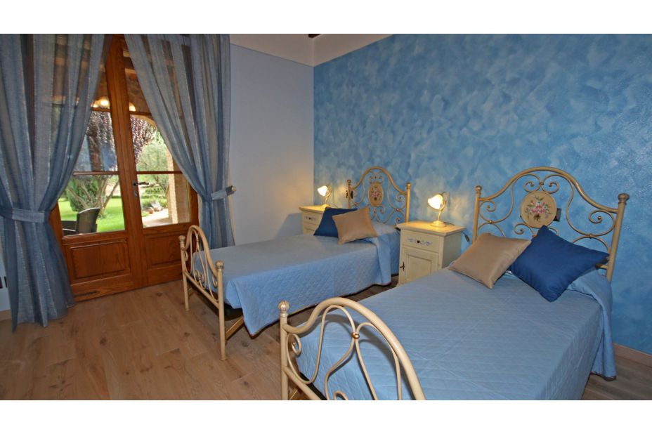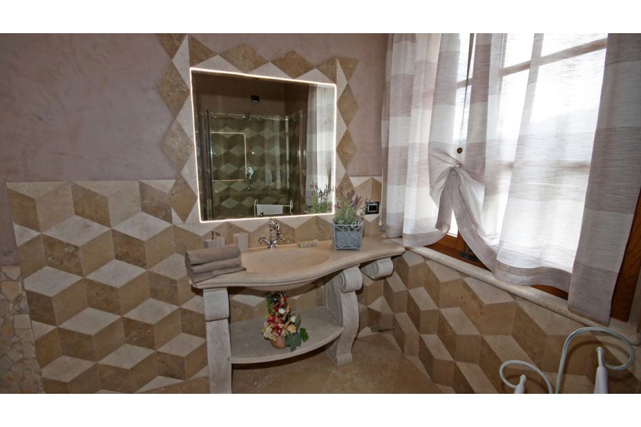 Eines der Doppelzimmer und das Zweibettzimmer verfügen über französische Fenster mit Blick auf den Portikus mit dem Sitzbereich. Eine externe Travertintreppe führt das oberste Stockwerk hinauf, das aus einem großen Wohnzimmer mit Sitz- und Essplatz, einer Küchenzeile und einer großen Panoramaterrasse mit Schiebefenstern, mit Essbereich im Freien, Grill und Holzofen besteht. Das Obergeschoss wird durch den Schlafbereich ergänzt: zwei Doppelzimmer mit jeweils eigenem Bad (eines mit Dusche und eines mit Hydromassage-Dusche und Hydromassage-Wanne) und ein Zweibettzimmer (mit zusammengefügten Betten), die von einem Badezimmer mit Hydromassage-Dusche und Farbtherapie serviert werden.