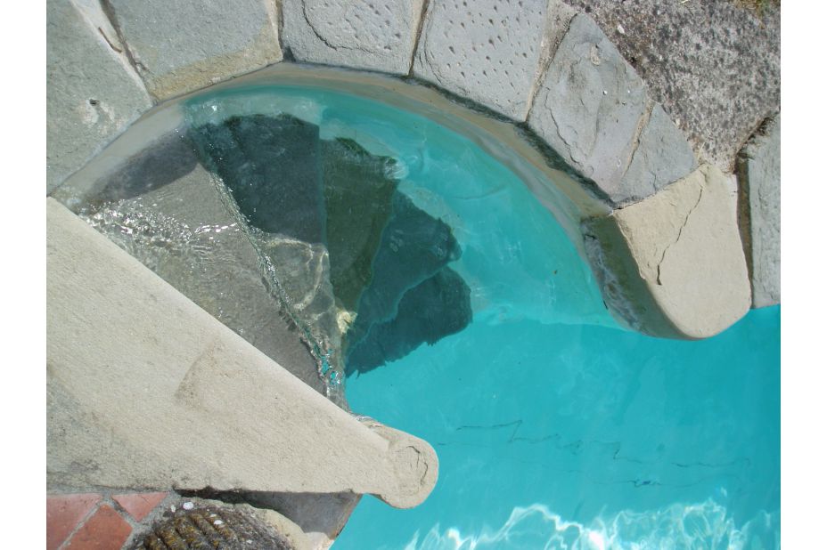 Der Pool hat ein ovales Becken mit Einstiegs-Stufen und ist mit Naturstein umrandet.