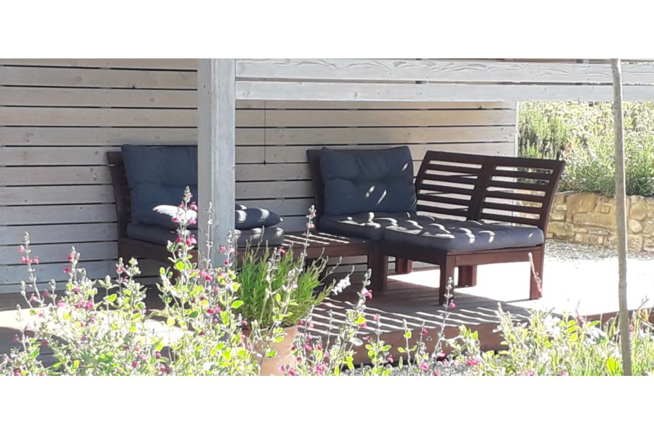 Schattiger und überdachter Sitzplatz mit Grill und Essplatz beim Haus.