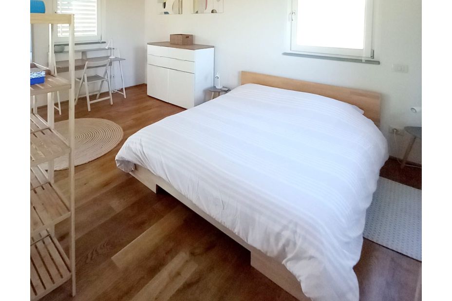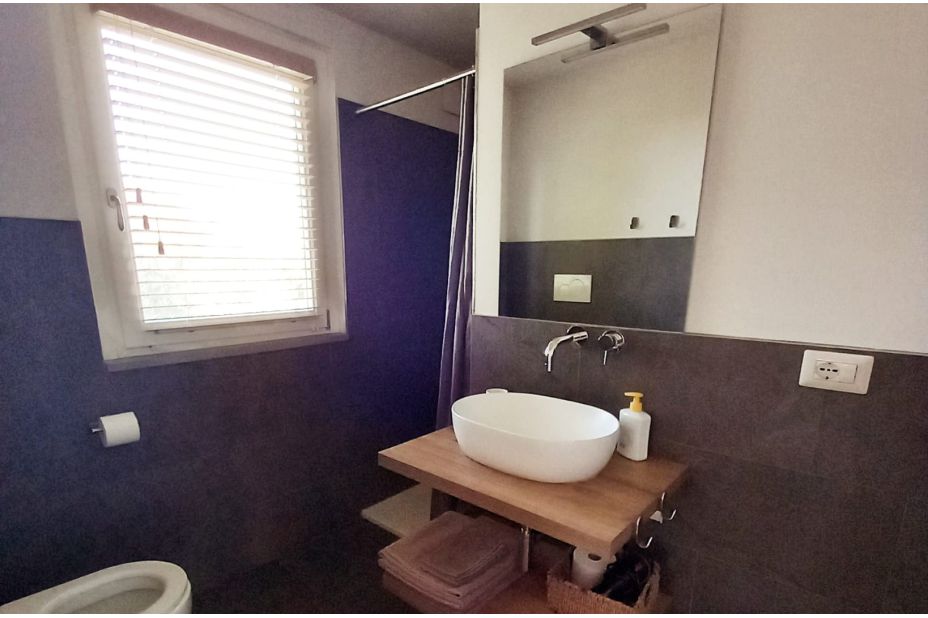 Es gibt ein Doppelbett (160 x 200 cm), eine voll ausgestattete Küche, ein Badezimmer mit WC, Waschbecken, Bidet und ebenerdiger Dusche,