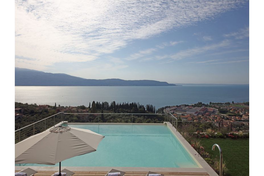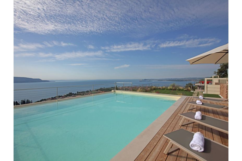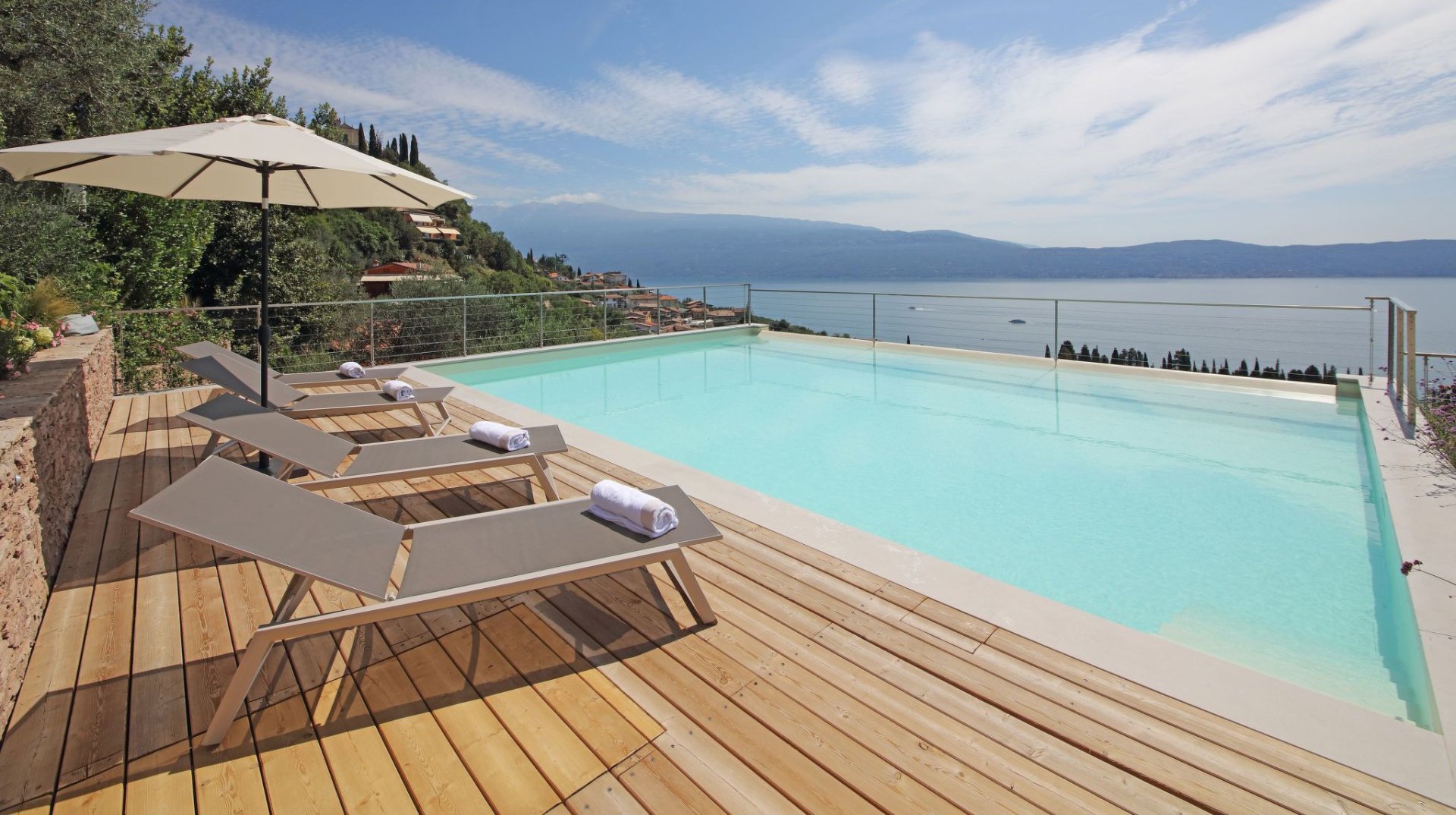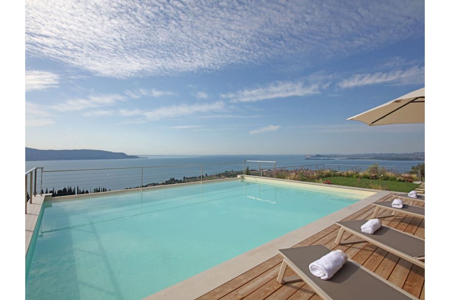 Der Panorama-Pool beefindet sich auf einerTerrasse mit unvegleichlichem Blick auf den See. Liegen und Sonnenschirme sowie