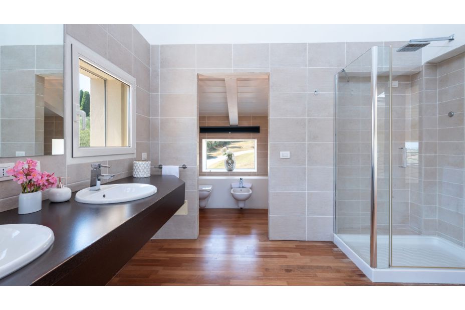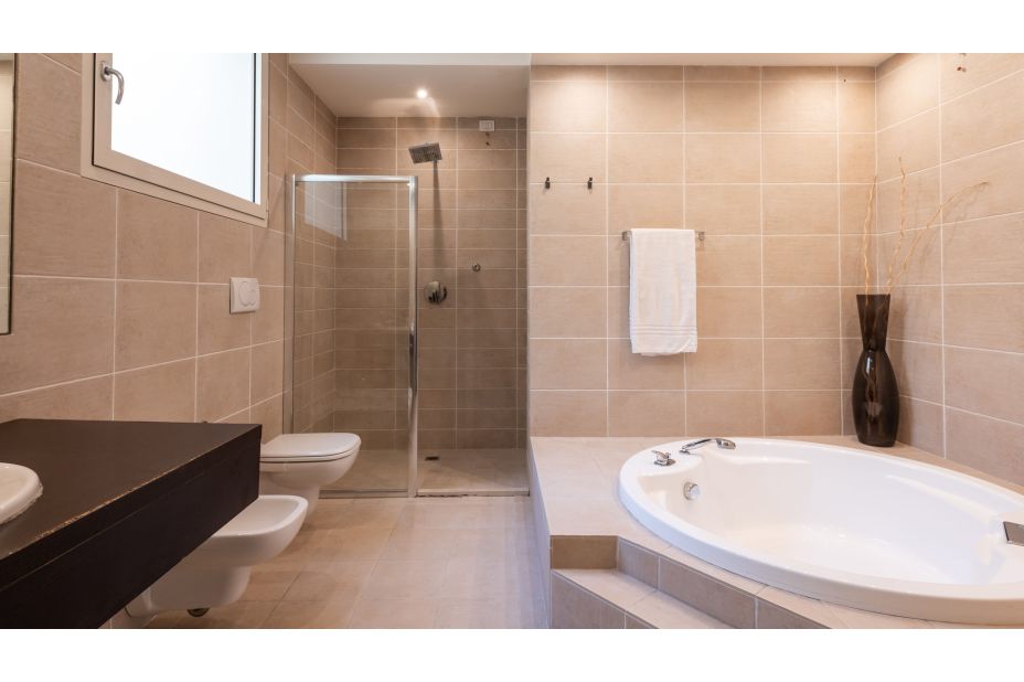 OBERE EBENE: Badezimmer (ohne Bidet). - Hauptschlafzimmer mit begehbarem Kleiderschrank, eigener Terrasse und eigenem Bad mit Dusche und Badewanne.