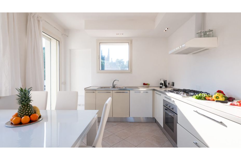eine moderne Küche mit direktem Zugang zum Garten und dem Whirlpool im Freien;