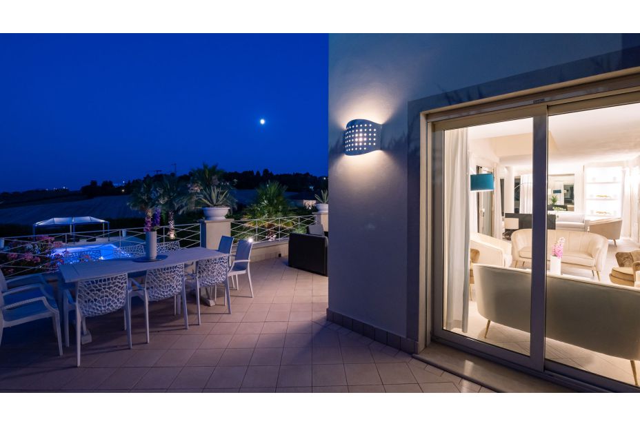 Eine große Panoramaterrasse umgibt das Erdgeschoss, mit Blick auf das Meer und den Pool; Essbereich; Holzsolarium mit Sesseln; beheizter Whirlpool (33 ° C) für vier Personen.