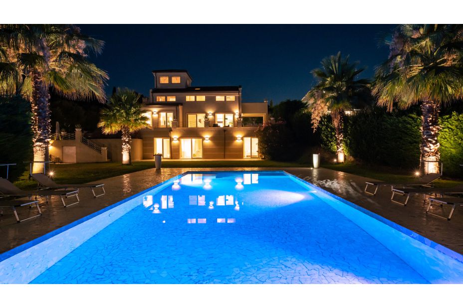 Es befindet sich auf der gleichen Ebene wie das Untergeschoss und kann auch durch Glastüren vom Essbereich und den beiden Schlafzimmern erreicht werden. Rechteckige Form; Abmessungen 15 x 4,5 m mit einer konstanten Tiefe von 1,30 m; Chlorreinigung; verspiegelte bichromatische palladische Beschichtung; große Eingangsstufen; LED-Atmosphärenbeleuchtung; große Poolterrasse mit passender Abdeckung, Sonnenliegen, Pavillon mit Segel, das einen Loungebereich schattiert.