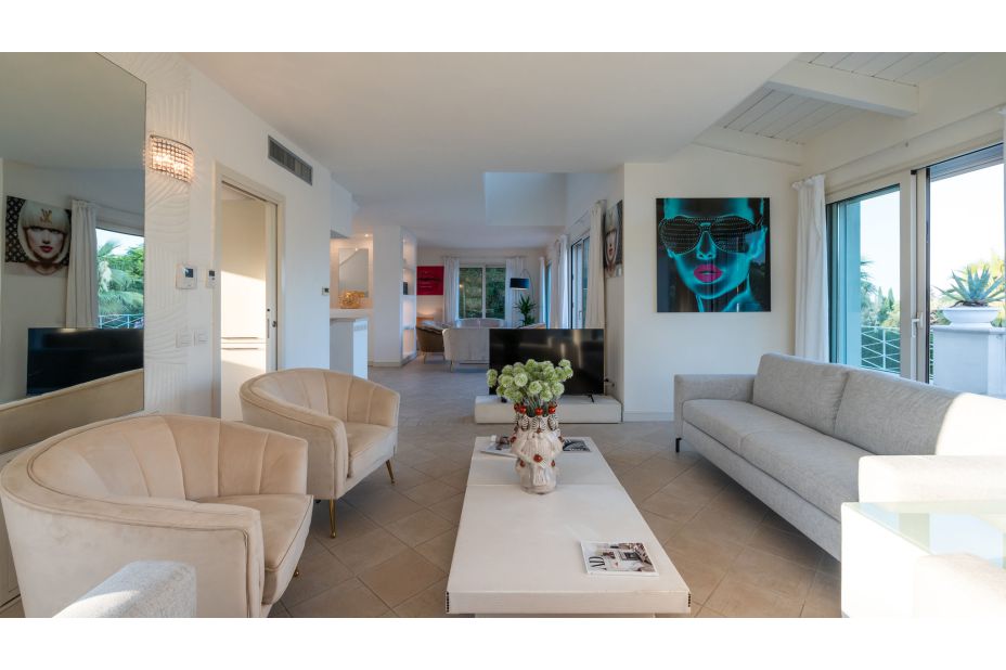 ERDGESCHOSS - Haupteingang, der zu einem großen offenen Raum mit einem Doppelwohnbereich, Sofas, Sesseln, Smart-TVs und großen Fenstern führt (teilweise Schiebefenster), mit direktem Zugang zur Panoramaterrasse;