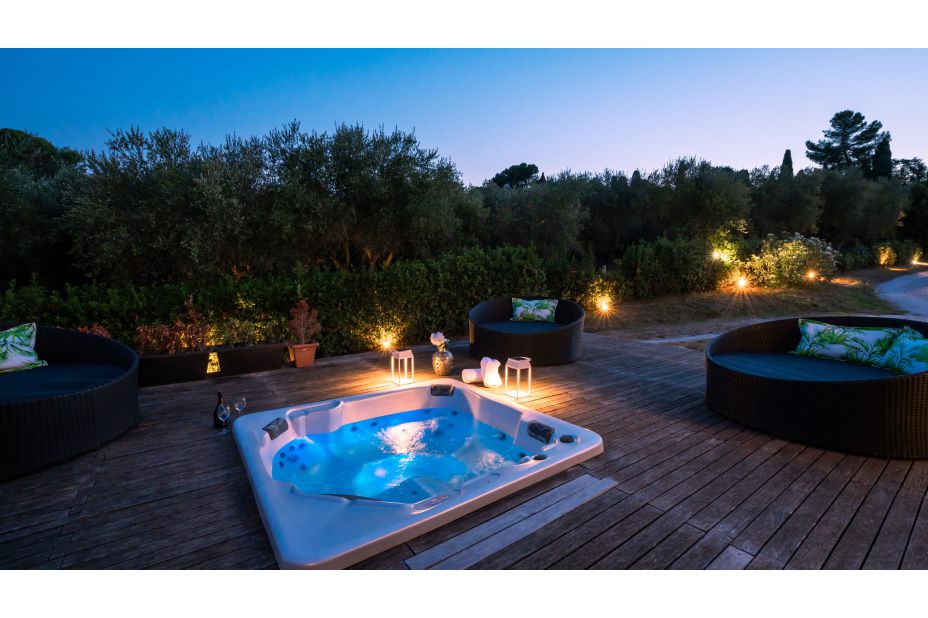 für 10 Personen ein helles Interieur, Dachterrassen und außergewöhnliche Annehmlichkeiten, darunter einen schönen Pool und einen beheizten Whirlpool im Freien.