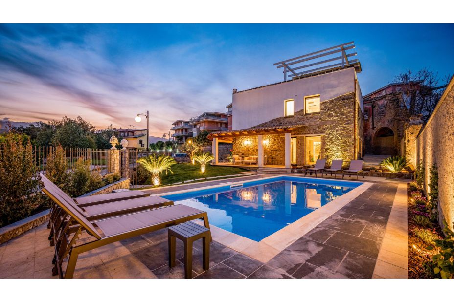 Der rechteckige Pool misst 8 x 4 m und hat eine konstante Tiefe von 1,20 m. begehbar über Treppe mit wenigen Stufen  und ist wird mit Chlor desinfiziert. Der Pool wird von einem Steinzeugboden begrenzt, auf dem Sonnenliegen und Sonnenschirme platziert sind; über den Steinzeugboden hinaus eine Wiese mit blühenden Rändern.