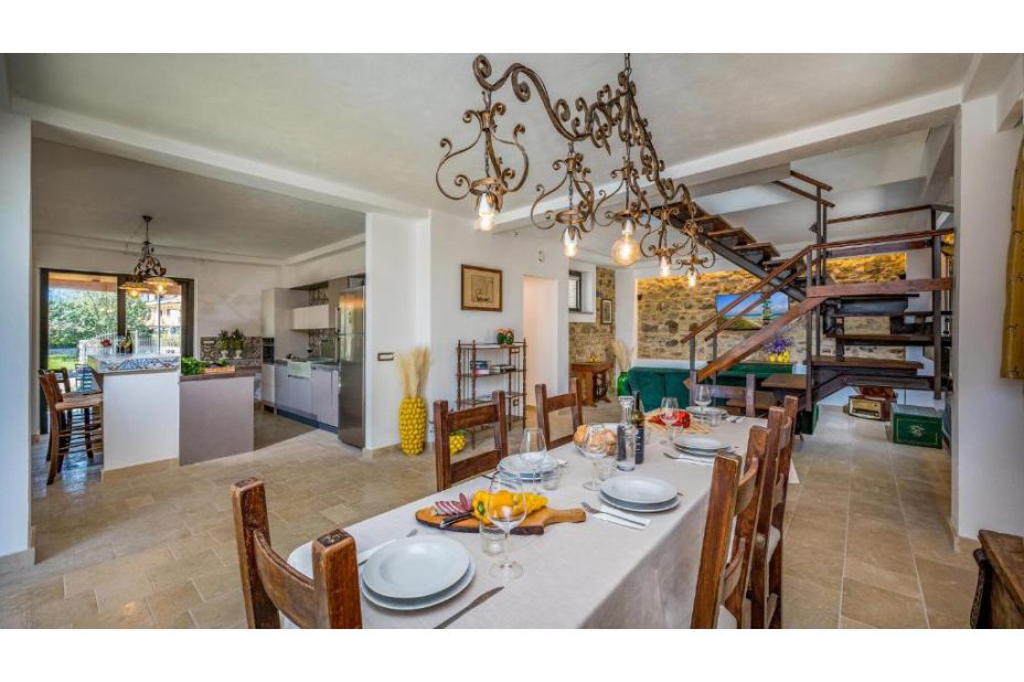 Die Villa ist auf zwei Etagen angeordnet. Der Haupteingang öffnet sich zu einem Wohnzimmer mit einem Essbereich und einem Sitzbereich mit einem Sofa und einem TV-Bildschirm. Die beiden Zonen sind durch die Treppe getrennt, die zum Schlafbereich im ersten Stock führt. Der Küchenbereich ist etwas abgeschieden, aber Teil dieser offenen und luftigen Umgebung.
