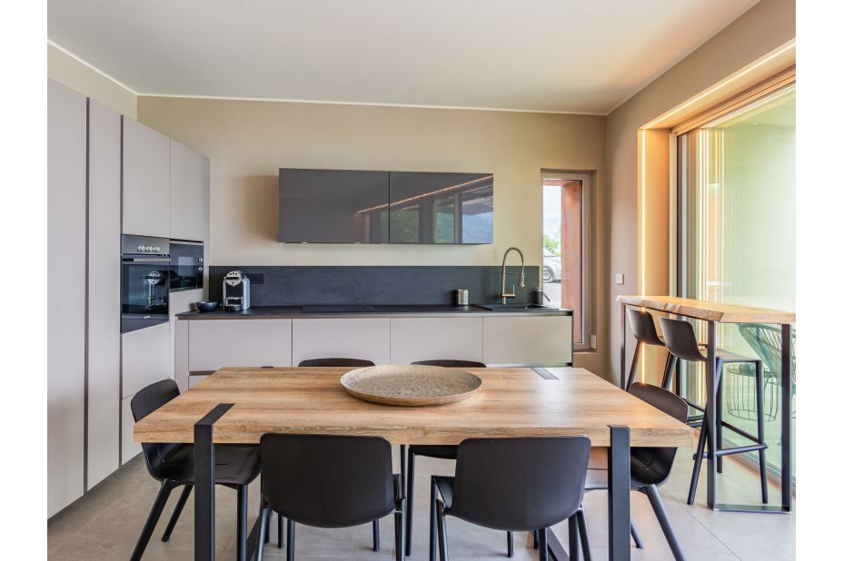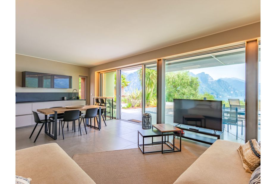 Objekt geeignet für 10 Erwachsene. Geräumig und hell, modern und stilvoll eingerichtet: grosses Wohn-/Esszimmer mit Schiebetür, Panoramafenster mit Esstisch und TV. Ausgang zum Garten, zum Schwimmbad.