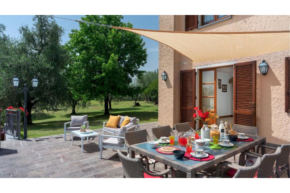 Das in Terrakotta gepflasterte Solarium ist mit Sonnenliegen und einem Pavillon mit Tisch und Stühlen ausgestattet.