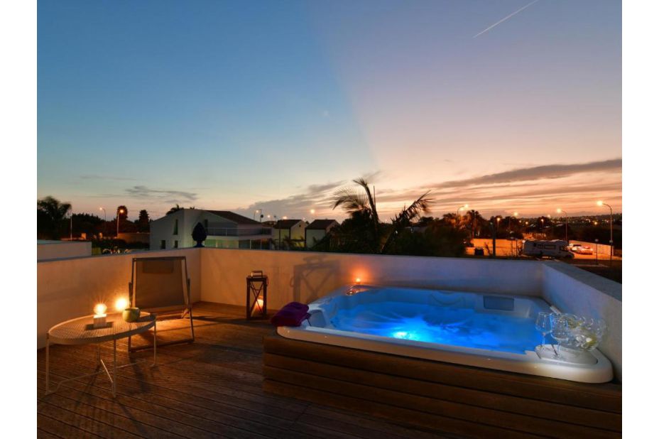 Privat-Pool, Whirlpool auf Dachterrasse, überdachte Außenbereiche, komfortable Einrichtung.