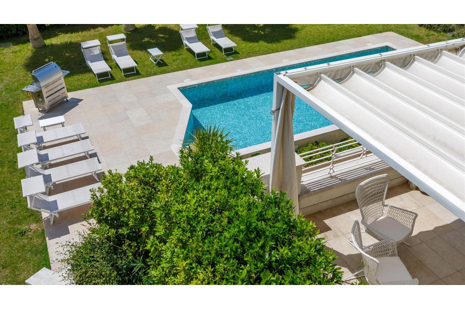 Der Solariumbereich ist mit Sonnenliegen ausgestattet, während Sie im gepflegten Rasen des Gartens, der ihn umgibt, für Momente der Entspannung oder des Spiels verweilen können.