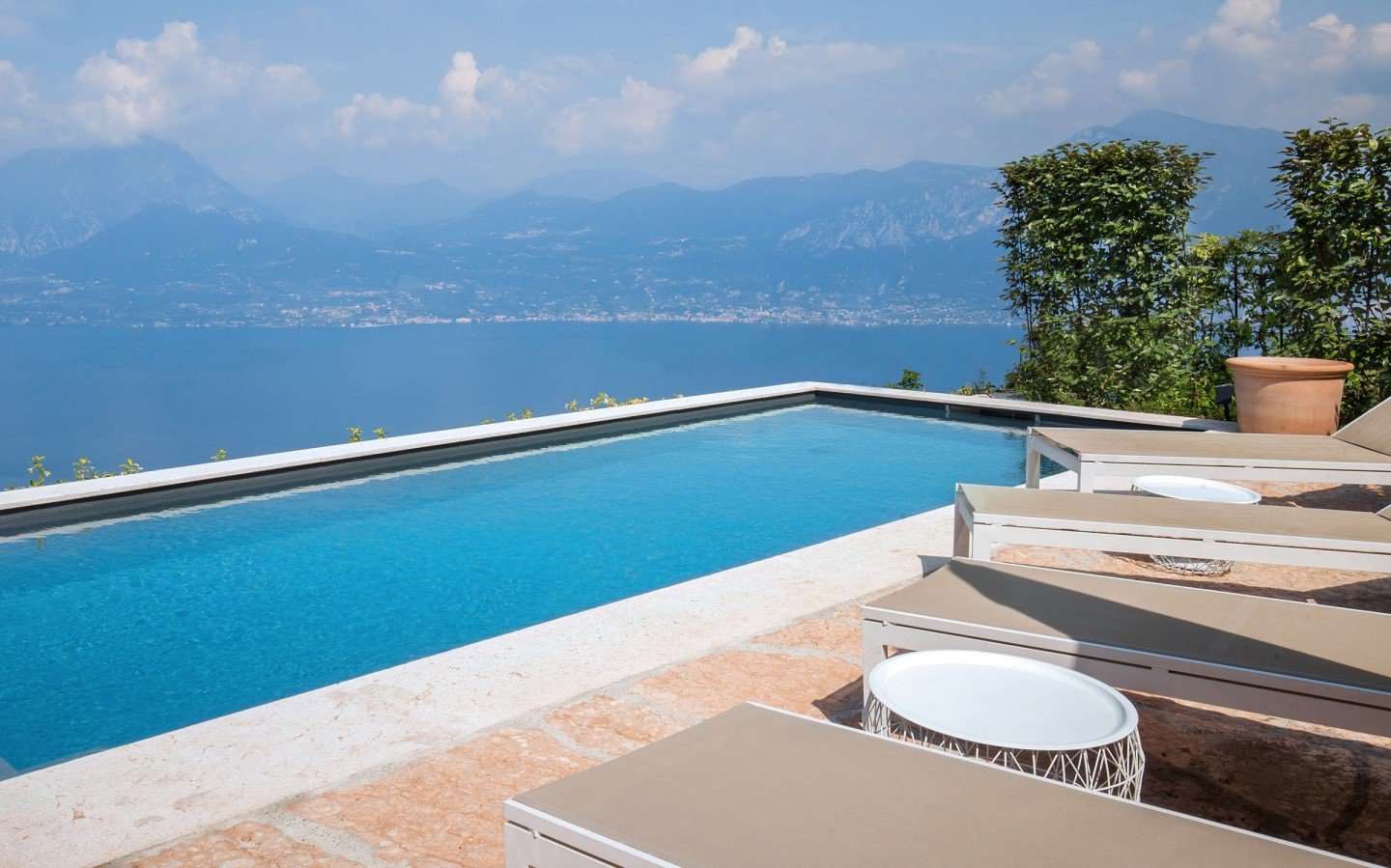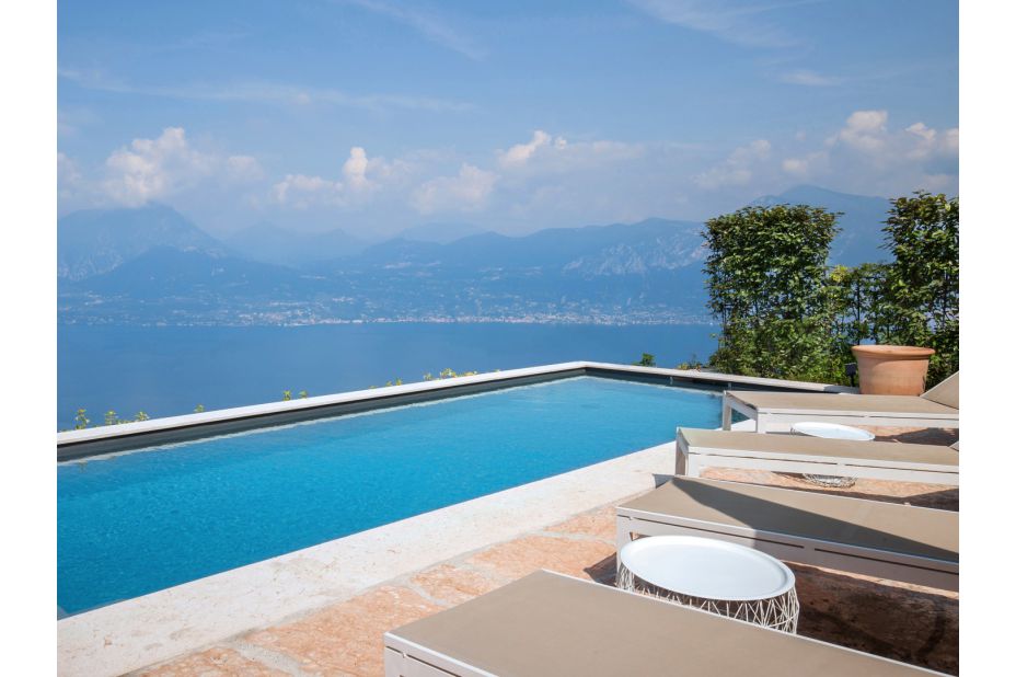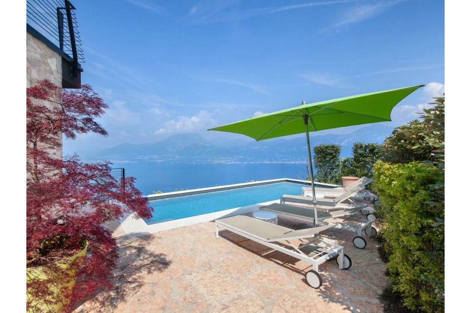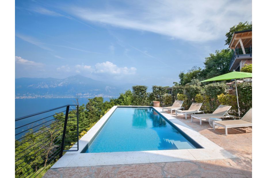 Der private Pool, integriert in die Terrasse, bietet einen weiten Blick auf den See und ist mit Liegestühlen für maximalen Komfort ausgestattet. Der Pool hat eine rechteckige Form mit den Abmessungen 3 x 8 m und eine konstante Tiefe von 1,40 m.