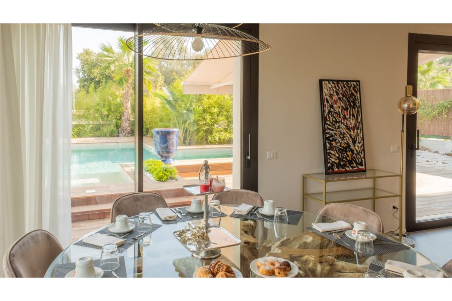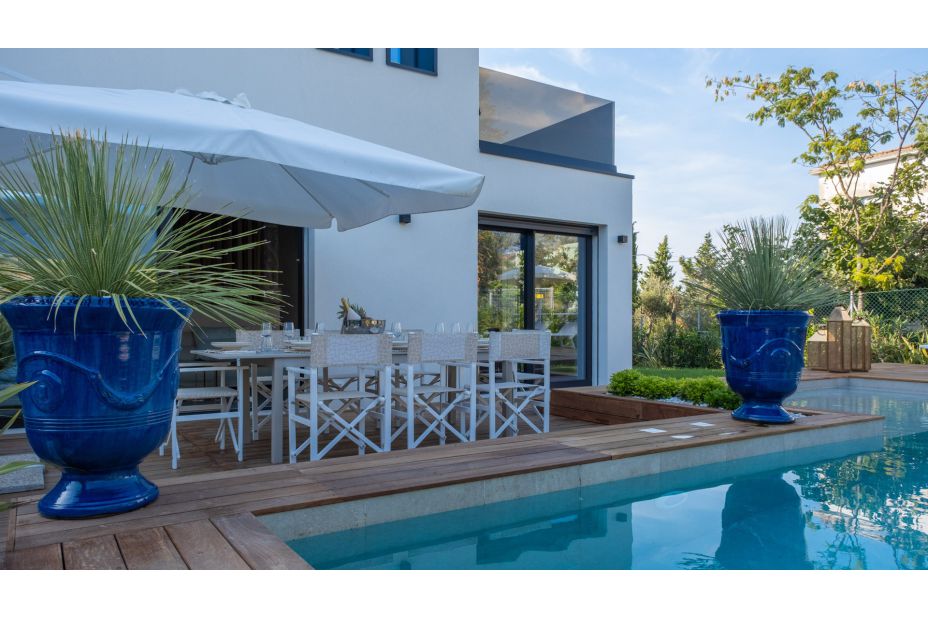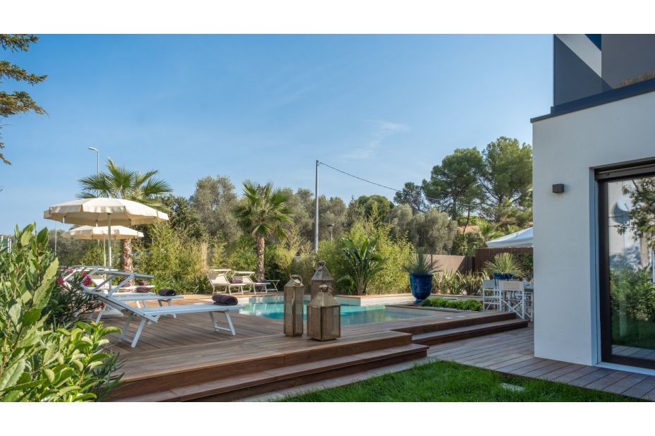 Der Pool befindet sich vor der Villa, im Vergleich zum Garten auf einer Holzplattform leicht erhöht. Er hat eine unregelmäßige Form, die etwa 45 Quadratmeter misst und die Tiefe variiert von 0,30 bis 1,20 m. Er ist mit Feinsteinzeug beschichtet und verfügt über ein Chlorreinigungssystem mit Sandfilter.