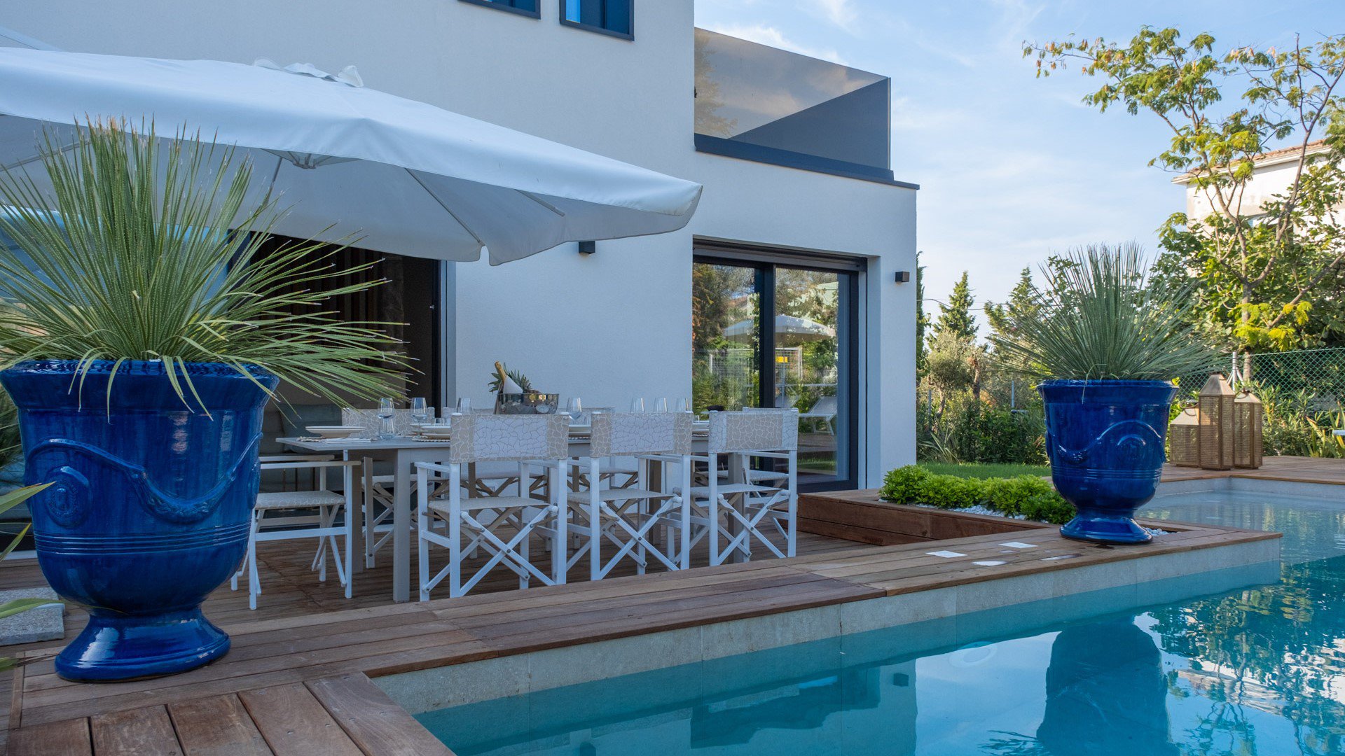 Dieses anspruchsvolle Ferien-Domizil verfügt über vier Doppelzimmer, ein elegantes Wohnzimmer mit offenem Raum und einen privaten Garten mit einem erhöhten Pool.