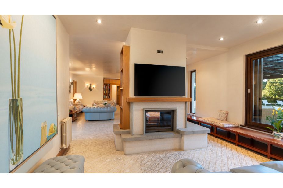 Geräumiges Wohnzimmer mit zwei Sitzecken, Esstisch, dekorativem Kamin und Zugang zur Terrasse;