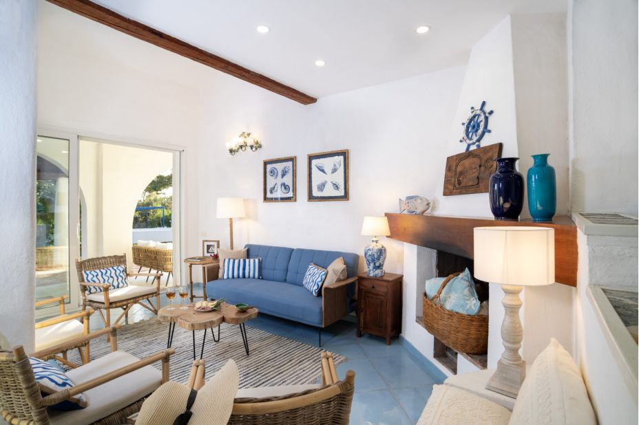 Vor dem Haus gibt es eine Außenecke mit Sofas und Tischen.