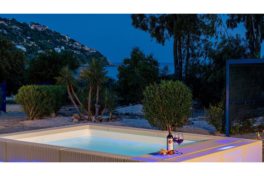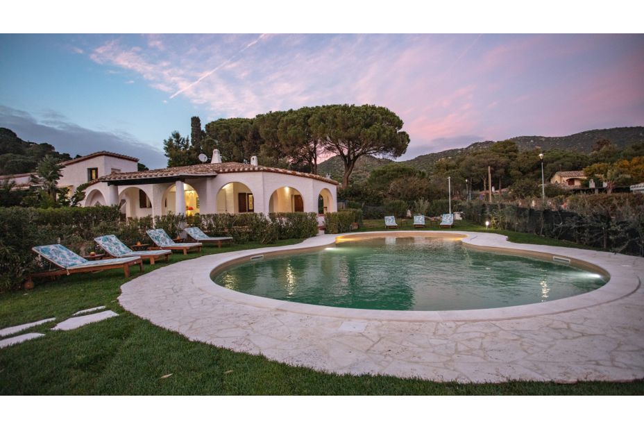 Überdachter Sitzplatz (Porticato) im Freien, gemauerter Grill, Liegen mit Sonnenschirm und zwei kleine Pools garantieren auch Familien mit Kinder einen herrlichen Aufenthalt am Meer.