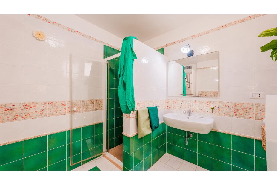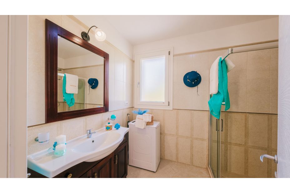 Im selben Bereich gibt es ein Badezimmer mit Dusche sowie eine Außendusche mit Warmwasser.