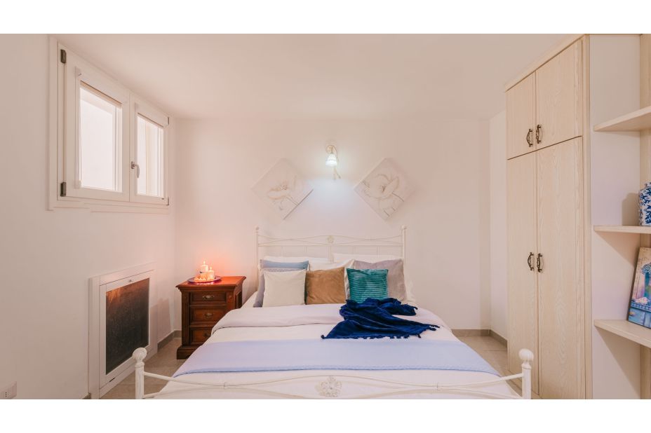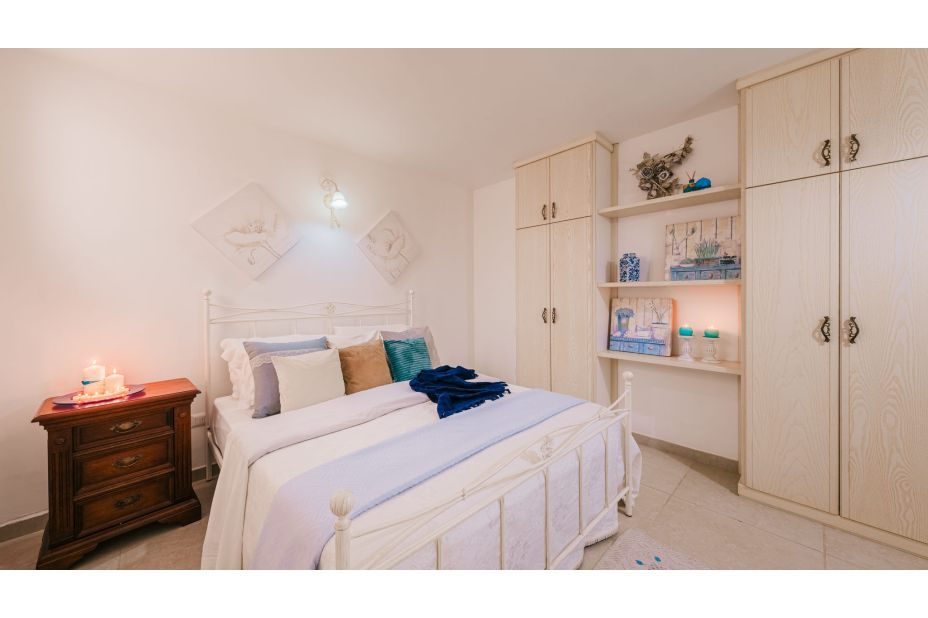 Von einer internen Marmortreppe aus betreten Sie das untere Geschoß, in dem sich drei Schlafzimmer und ein Badezimmer mit Dusche befinden. Der nüchterne und elegante Stil und die sanften Farben verleihen den Zimmern ein gemütliches und entspannendes Aussehen.