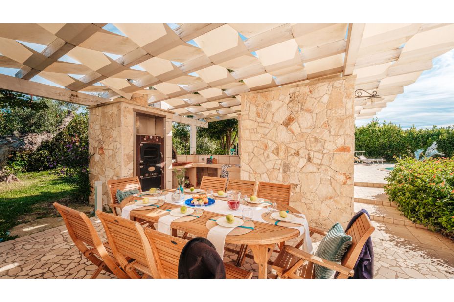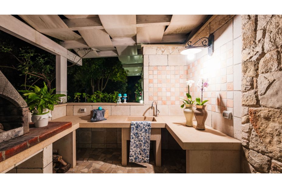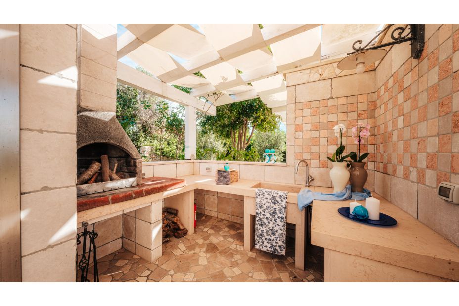 Das besondere Highligt dieses Domizil ist neben der Nähe zum Meer und der private Pool, ein großer Outdoorbereich mit Küche, Holzofen, Grill und kompletter Wohn-/Essbereich für sommerlich Aufenthalte für Mahlzeiten und gesellige Stunden.