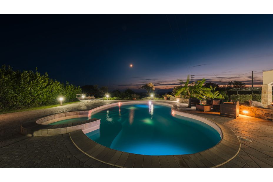 Die Beleuchtung des Pools ermöglicht es Ihnen, die abendliche Erfrischung zu genießen, die nur ein Tauchgang im Mondlicht reservieren kann.