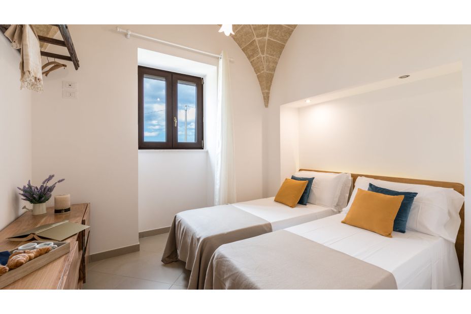 Das Solarium, gepflastert in Trani-Stein, ist mit Sonnenliegen und Außendusche mit kaltem Wasser ausgestattet.