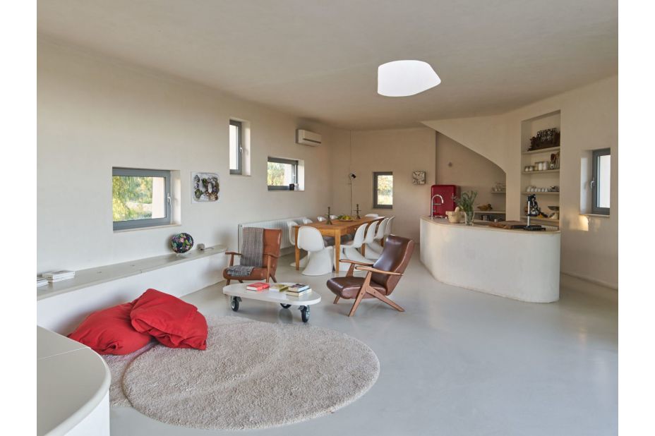 WOHNZIMMER 1- mit einer großen Betonbank/-sofa mit Kissen zum bequemen Sitzen, Sesseln, Poufs, voll ausgestatteter Küche, mit Elektroherd, Elektrobackofen, Kühlschrank mit Gefrierfach, Geschirrspüler, Waschmaschine, Kaffeemaschine, Toaster, Wasserkocher,