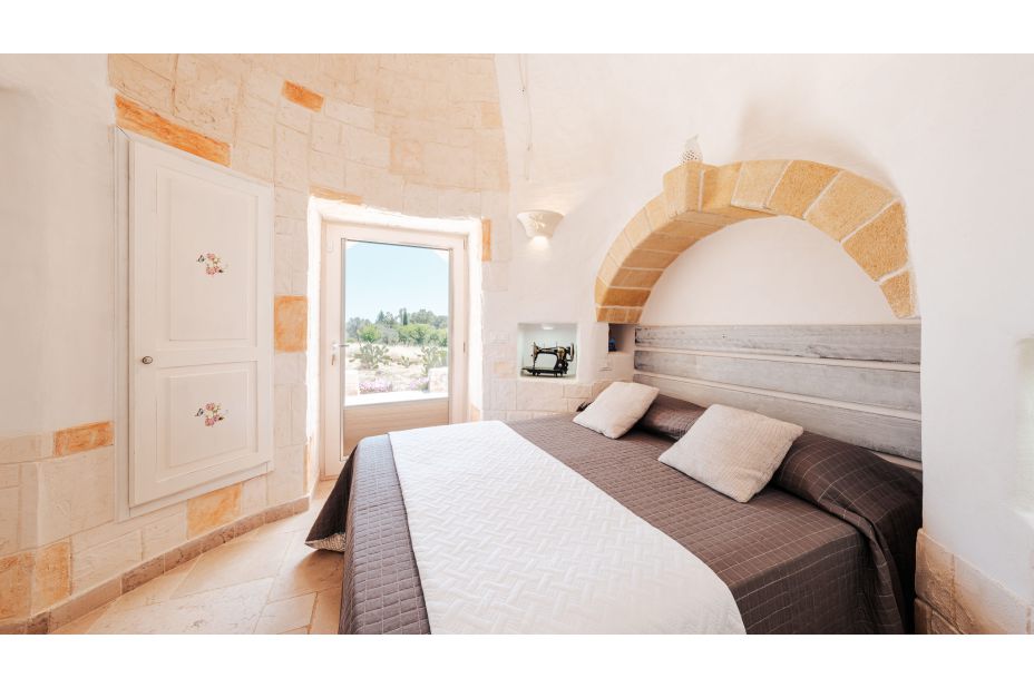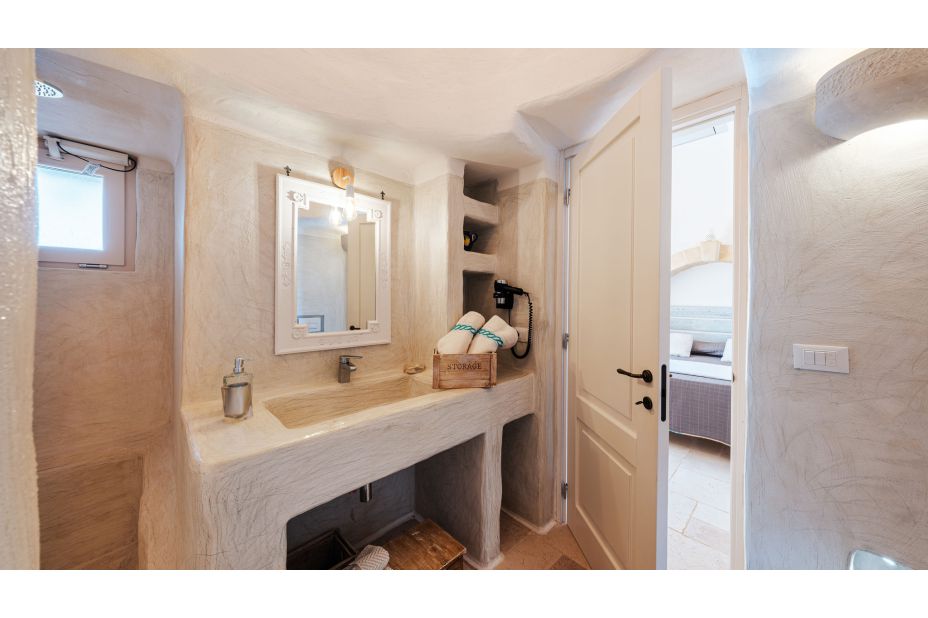 Ein Korridor führt zum Schlafbereich. Das Trullo-Zimmer ist ein Doppelzimmer mit eigenem Bad mit Steinbadewanne und Dusche. Die anderen beiden Schlafzimmer sind ein Doppelzimmer mit eigenem Bad mit Dusche und ein Doppelzimmer mit Einzelbetten immer mit eigenem Bad mit Dusche.