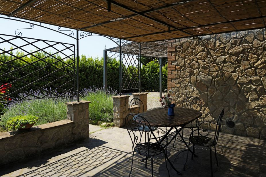 Überdachter Eingangsbereich mit Tisch und Stühlen.